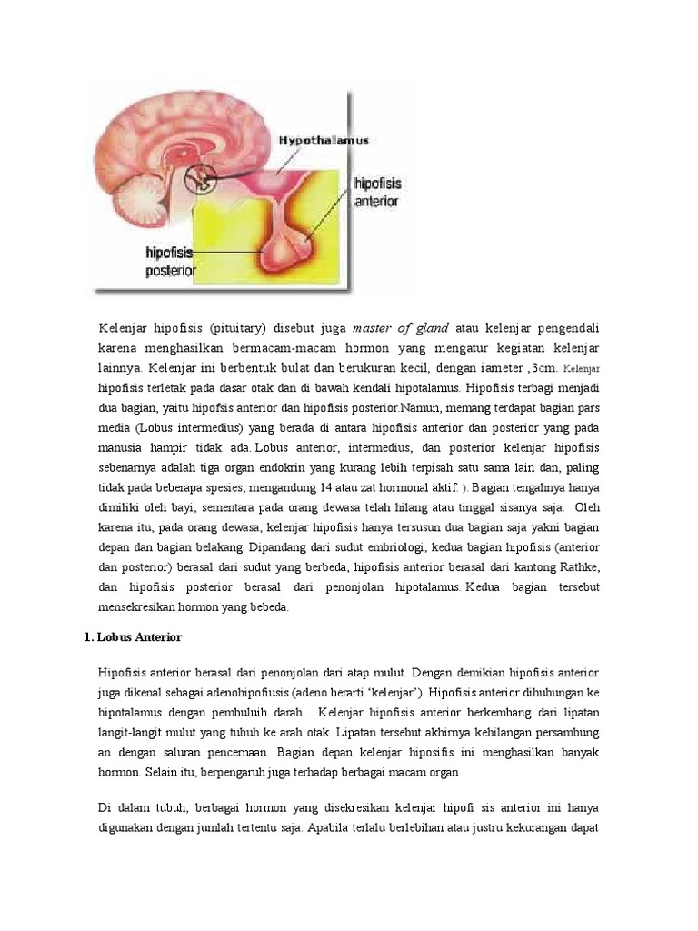 Kelenjar Hipofisis from imgv2-1-f.scribdassets.com Kelenjar hipofisis hipofise terletak di sella tursika, lekukan os spenoidalis basis cranii. Kelenjar hipofisis ini biasa dinamakan dengan master of gland atau kelenjar pengendali, hal tersebut karena kelenjar ini mempunyai fungi yang. Kelenjar hipofisis mensekresikan berbagai macam hormon yang mengatur berbagai kegiatan dalam tubuh. Aktivitas hipofisis sendiri dikendalikan oleh hipotalamus dan mekanisme feedback dari target organ. Diproduksi dan disekresikan ke dalam darah oleh sel kelenjar endokrin dalam jumlah sangat kecil. Kesesuaian yang tepat antara hormone yang diproduksi oleh hipofisis dengan fungsinya adalah sebagai berikut, kecuali … * coba bandingkan kedua gambar tersebut. Kelenjar hipofisis/pituitari disebut juga master of gland. Ini mengatur aktivitas hormon di kelenjar dan organ endokrin lainnya.